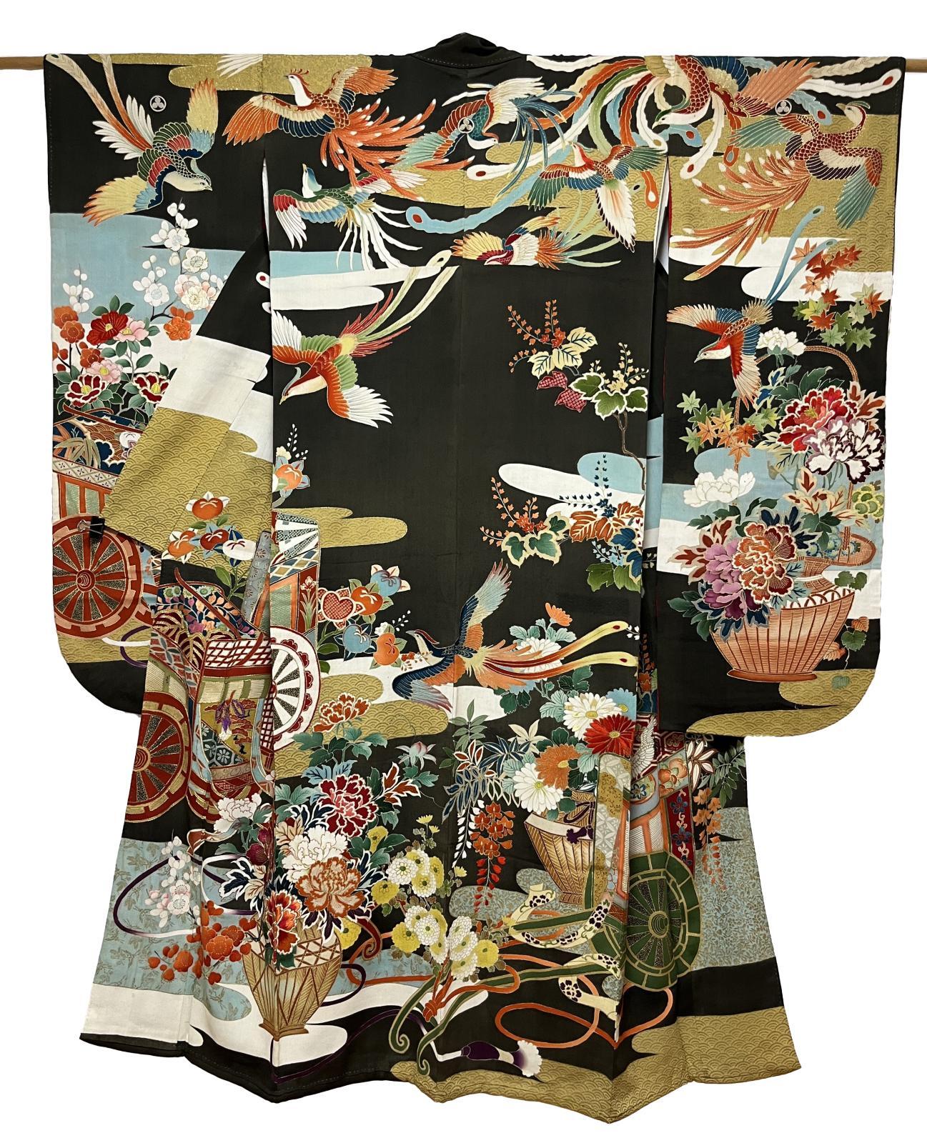正絹 / アンティーク 婚礼黒引き振袖 / 鳳凰 / 御所車 / 花籠 / 花車