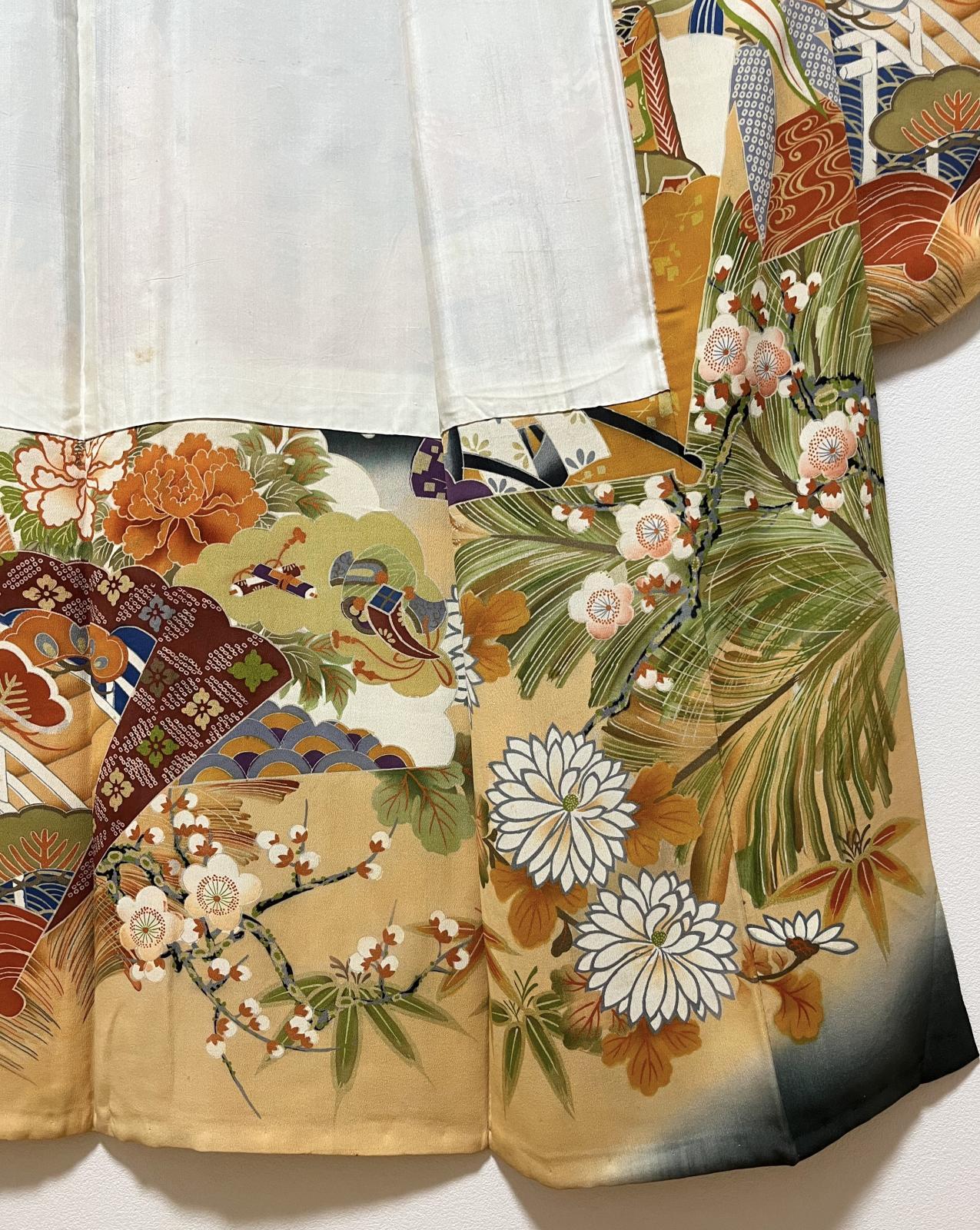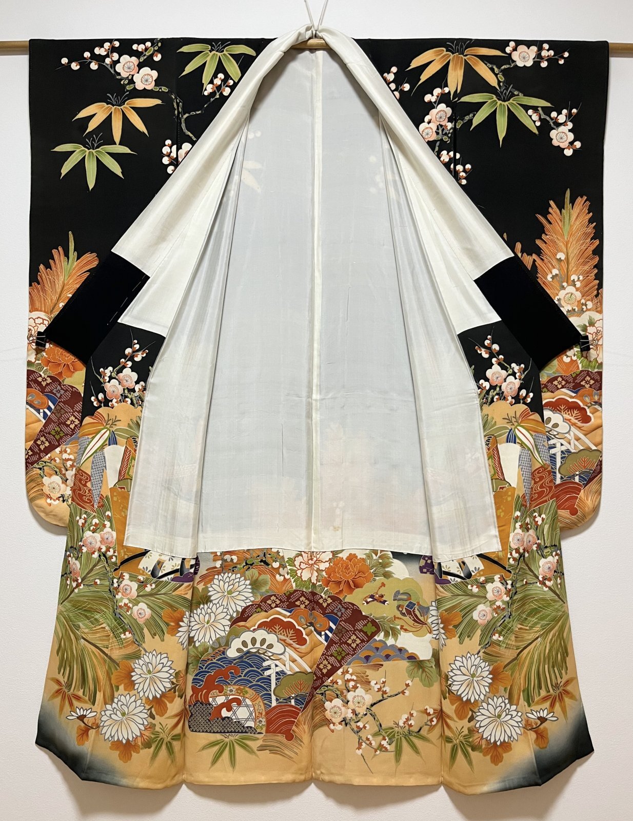 正絹 / アンティーク 婚礼黒引き振袖 / 松竹梅 / 御所車 / 扇面 / 広衿 [0009]
