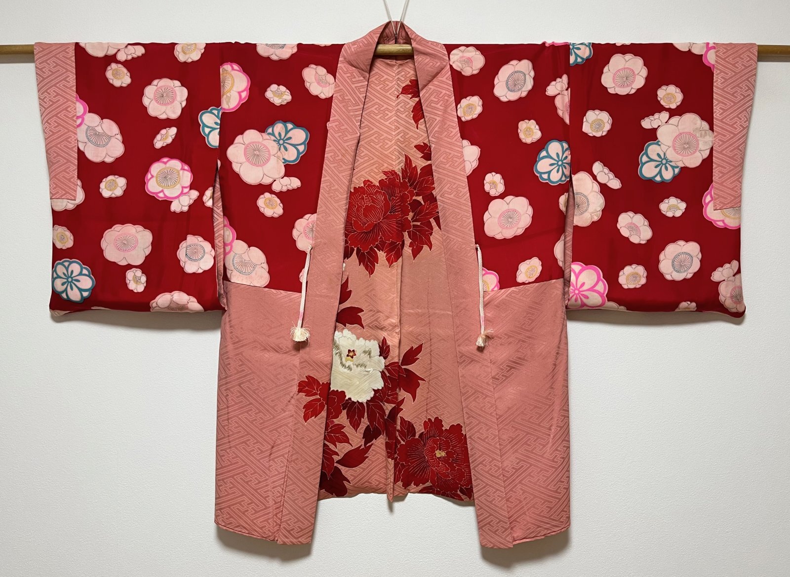 正絹 / アンティーク 羽織 / 牡丹 / 紗綾形 / 手刺繍 / コーラル