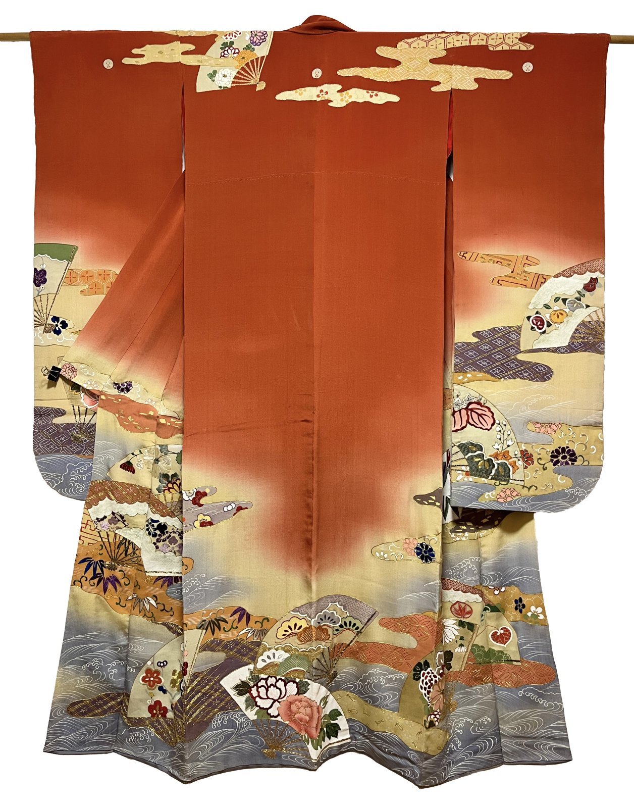正絹 / アンティーク 振袖 / 扇 / ヱ霞 / 金彩 駒刺繍 / ブラウン