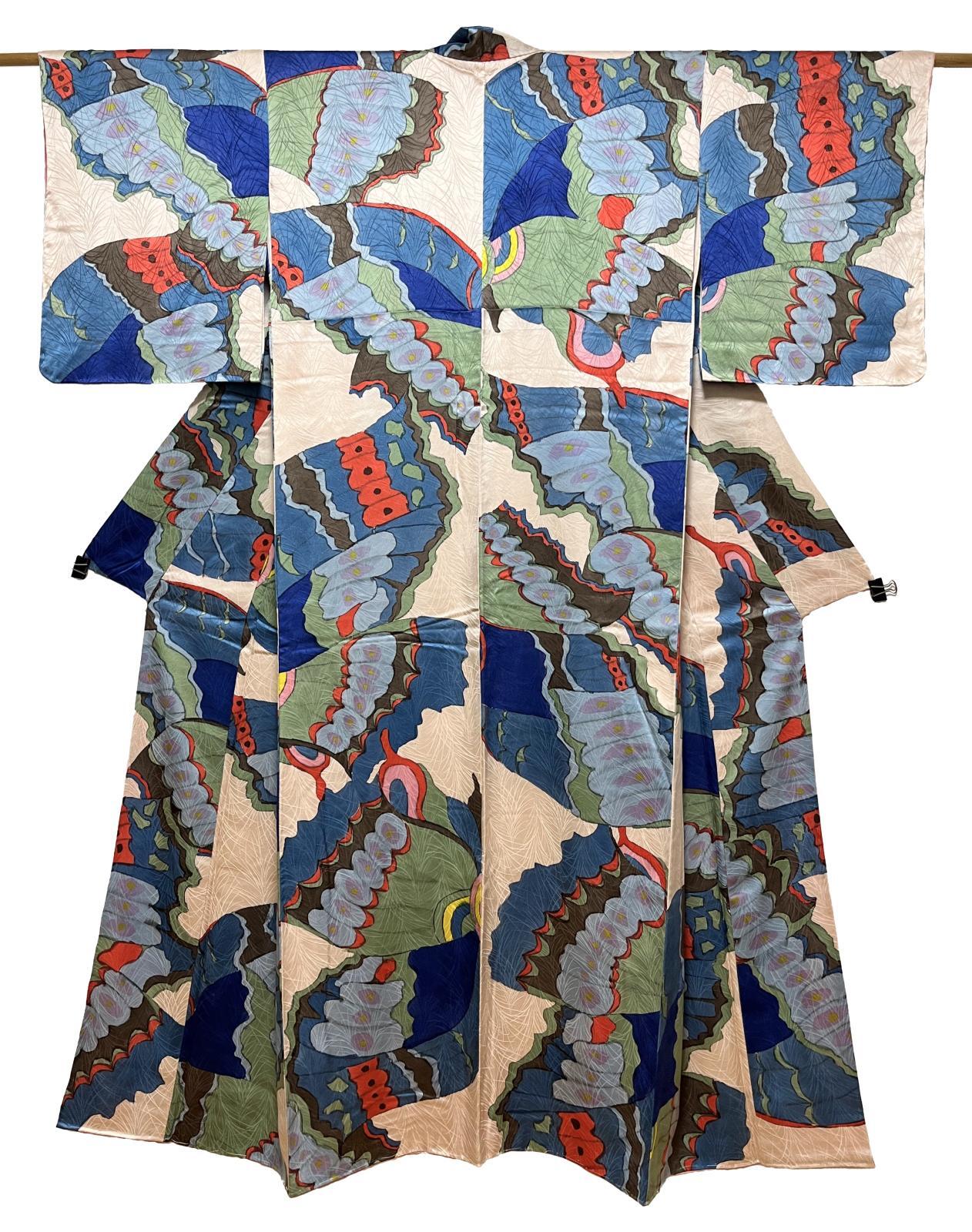 正絹 小紋 / 手描きの蝶 / ブルー x ライトベージュ