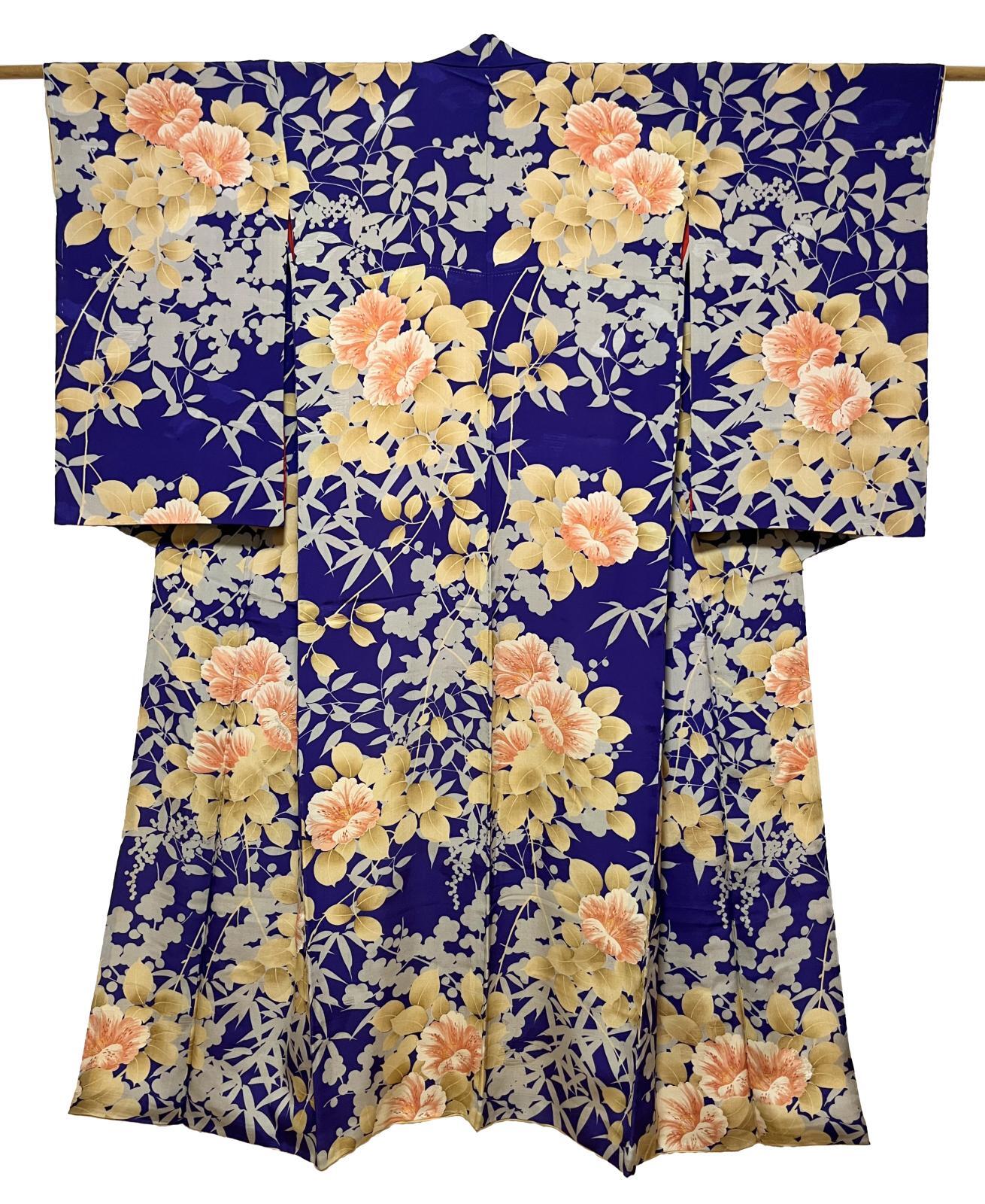 正絹 / アンティーク 小紋 / 刺繍入り花文 / 南天 / 濃青